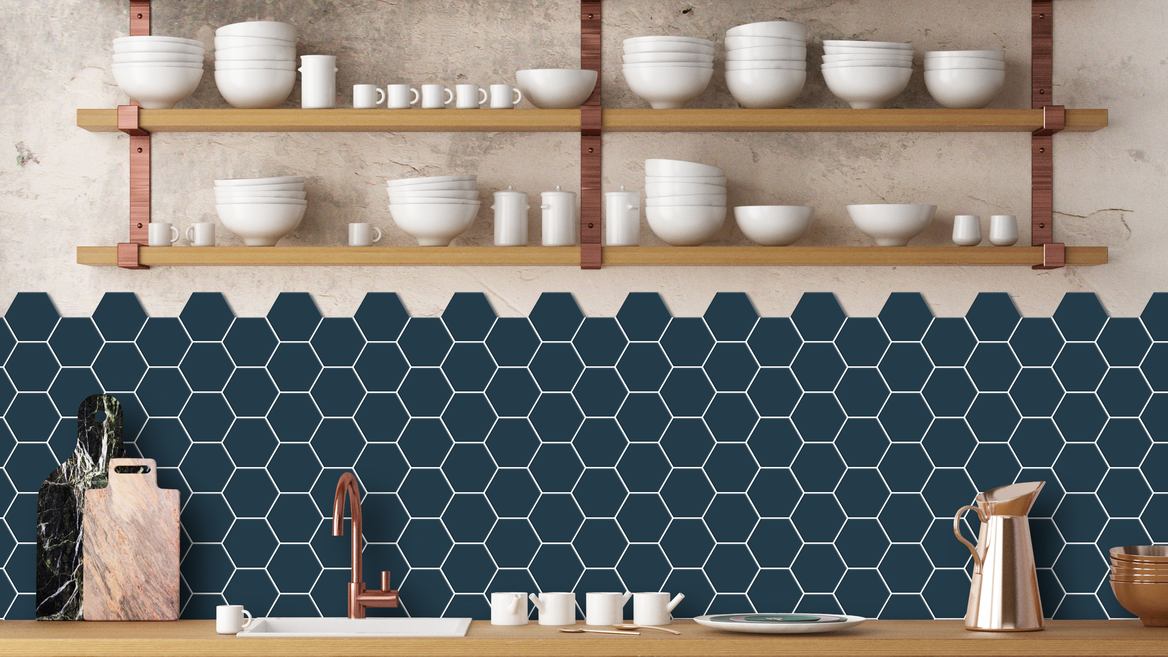 Wirklich eine innovative Küchenrückwand? NEU: unsere Refined Edge-Serie, ausgeführt in diesem wunderschönen Hexagon-Fliesendesign. Die Platte wird nach der Form gefräst und kann auf vielfältige Weise kreativ eingesetzt werden. Die Farben 'Goddess Green' und 'Misty Blue' sind die Farben des Augenblicks, andere Farbtöne auf Anfrage.